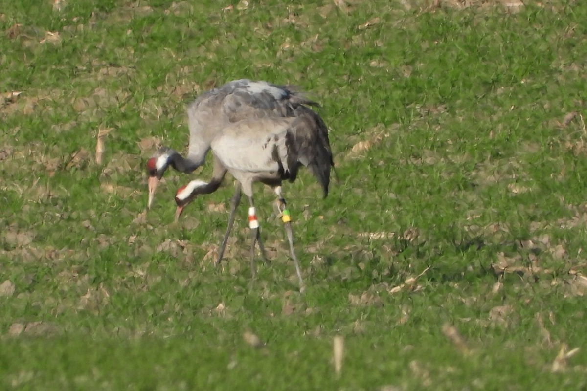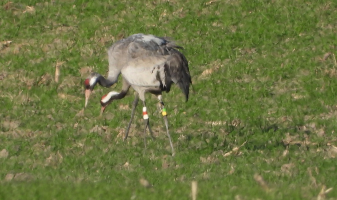 Tschechischer Kranich mit Fußringen und Sender – Foto: J. Kasper am 8. April 2026, Diehsa, Feldflur NE